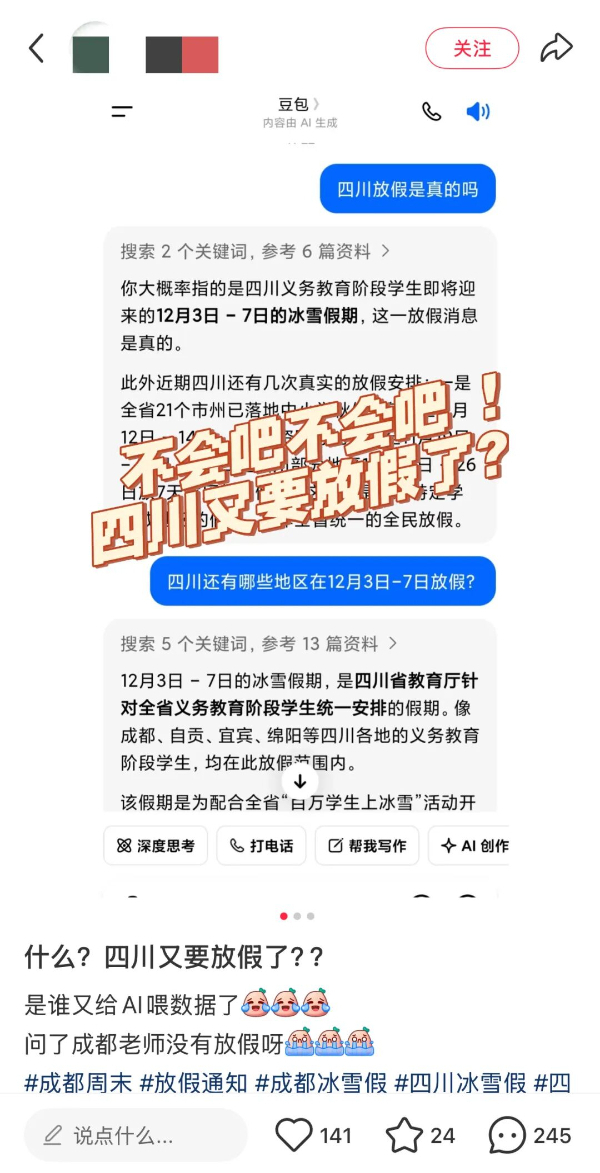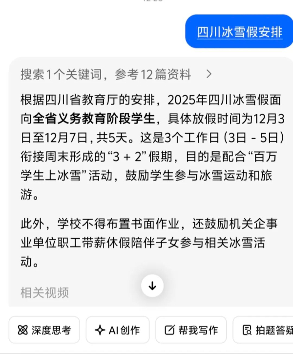 这“有模有样”的通知哪来的?记者亲测,在某AI软件里输入“四川冰雪假安排”,它立刻“活学活用”,生成了一套包含具体日期的“官方安排”。