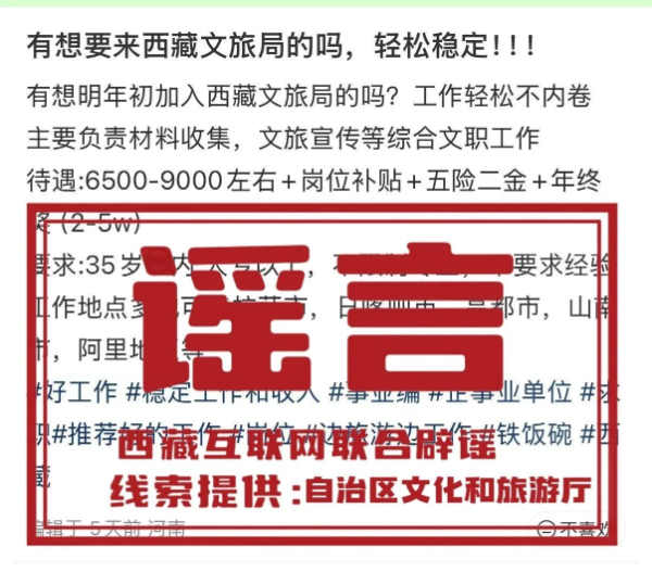 近日,在网络平台上,出现所谓“西藏文旅局”招聘信息,声称会提供“轻松稳定”“多地可选”的事业编制岗位。经核实,该信息内容不实,属虚假信息。