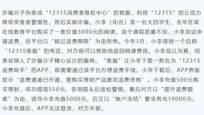 虚假退费诈骗披着“全国12315平台”“市场监管局”等权威外衣,引导通过二维码、网址链接、安装包等方式下载安装可疑APP,窃取银行卡、密码、验证码、生物识别等信息,需要警惕充值、解冻、提速等诈骗信号;防范此类诈骗的关键在于构建“官方核实—信息保护—冷静操作”的三道防线。任何涉及退费的通知,都应通过机构官网、官方APP等原始渠道交叉验证,切勿轻信陌生短信或私人社交账号的信息。