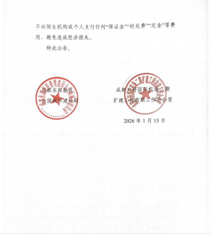 为切实保障群众合法权益,防范虚假招工、工程诈骗等不法行为,成都东部新区公园城市建设局、成都天府国际机场二期扩建工程前期工作办公室向广大市民郑重公告如下。