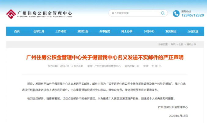 1月15日,记者从广州住房公积金管理中心获悉,近日,发现有不法分子假冒该中心名义发送不实邮件,邮件内容为“关于近期住房公积金缴存基数调整及账户核验的通知”。该信息不实。