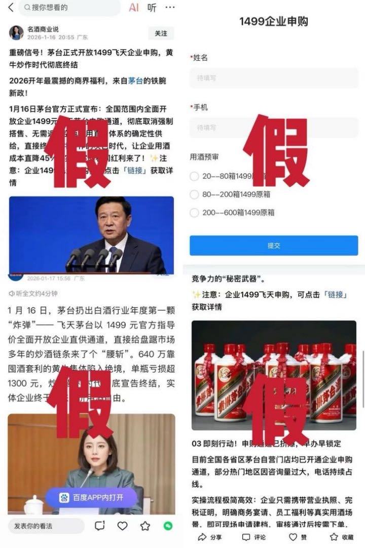 茅台方面称,近期网络上流传的“开放企业直供通道”“1499元飞天茅台企业申购入口”“无需搭售立即申请”等宣传内容均属不实信息。