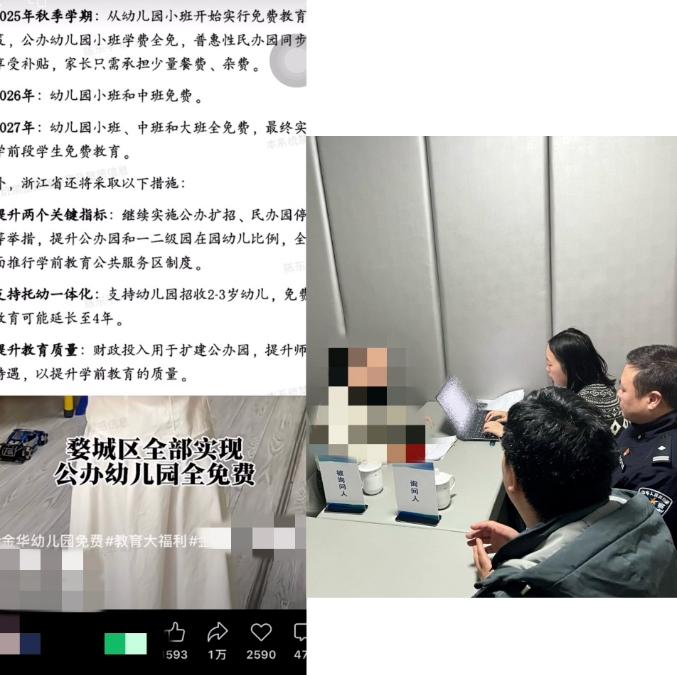 金华市婺城区网信办工作发现,某短视频平台账号“andy**”发布视频,称“根据官方政策,从2025年秋季开始,婺城区全部实现公办幼儿园全免费”,引发大量网民转发、点赞和评论。经查,该账号负责人谢某为吸引流量、博取关注,编造公共政策并在网络平台传播,扰乱正常社会秩序。