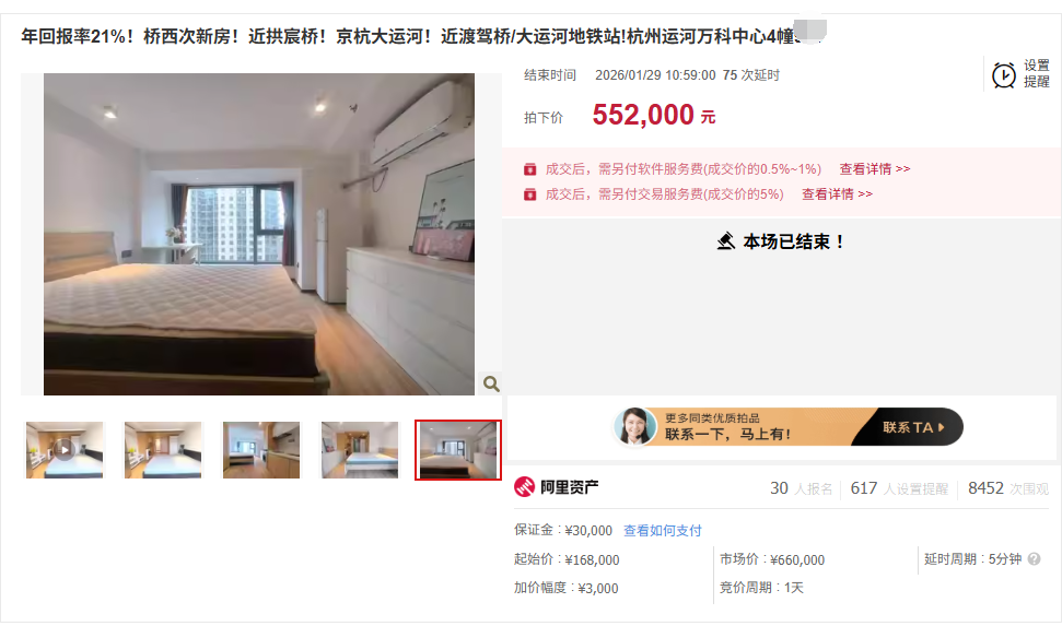 不久前,一套拱墅区近大运河地铁站的酒店式公寓在商拍平台拍卖,宣称“年回报率达21%”。吸引了30人报名,超600人设置提醒,近8500次围观,直到100次出价后终于成交,建筑面积37.24 平方米,拍下价为55.2万元。