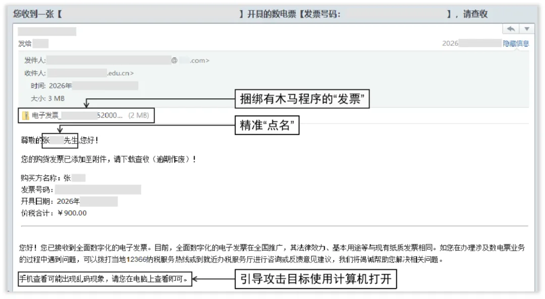 “【电子发票】张某某先生,您的发票已开好,请点击下载”——当收件箱弹出这类带着你真实姓名的电子邮件,你是否会下意识点击?注意!这可能是境外间谍情报机关实施的精准网络攻击。一旦点击邮件中的附件或者链接,设备将瞬间沦为间谍窃密的“突破口”,安全风险随之而来。