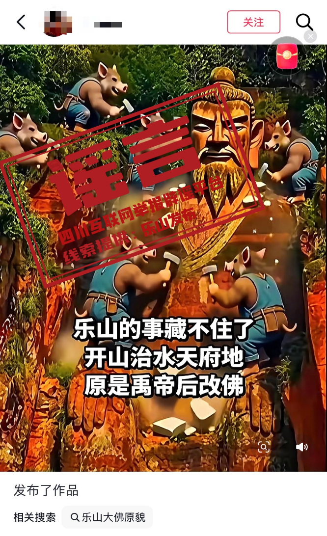 记者注意到,“乐山大佛是大禹雕像改建”的说法可追溯至数年前,近期再度被部分网民以视频、帖文形式,进行传播。不少内容还是AI生成,以及通过P图将乐山大佛头像换成大禹头像,并配文:甭管真假,看着顺眼多了。