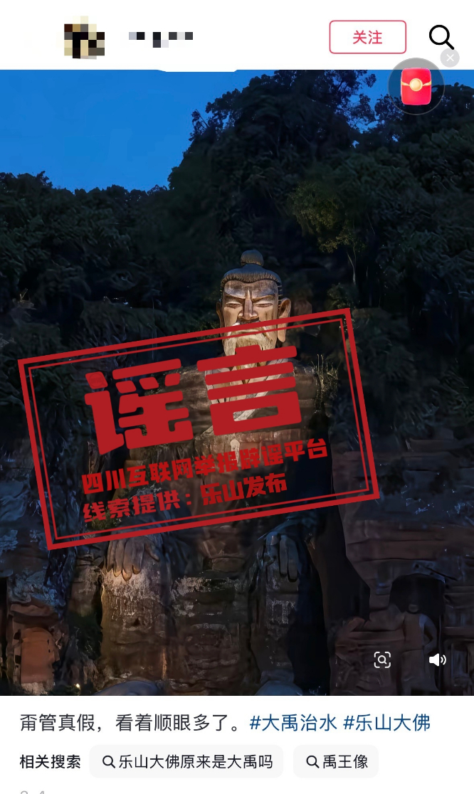“乐山大佛实际是大禹雕像”谣言。图据网络
