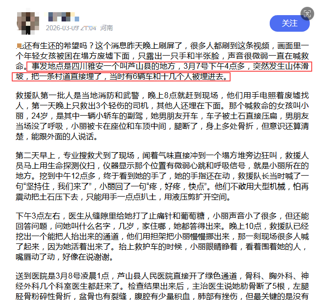 3月9日,有网民发帖称:“她还有生还的希望吗?这个消息昨天晚上刷屏了,很多人都刷到这条视频,画面里一个年轻女孩被困在塌方废墟下面,只露出一只手和半张脸,声音很微弱一直在喊救命。事发地点是四川雅安一个叫芦山县的地方,3月7号下午4点多,突然发生山体滑坡,把一条村道直接埋了,当时有6辆车和十几个人被埋进去”。