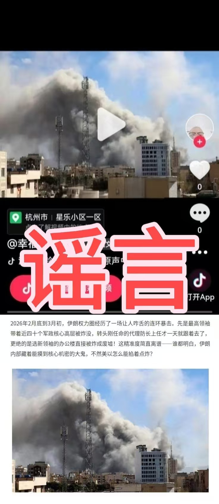 #捉谣记#辟谣!有账号将一火灾事件发生地错误标注为杭州临平某小区!