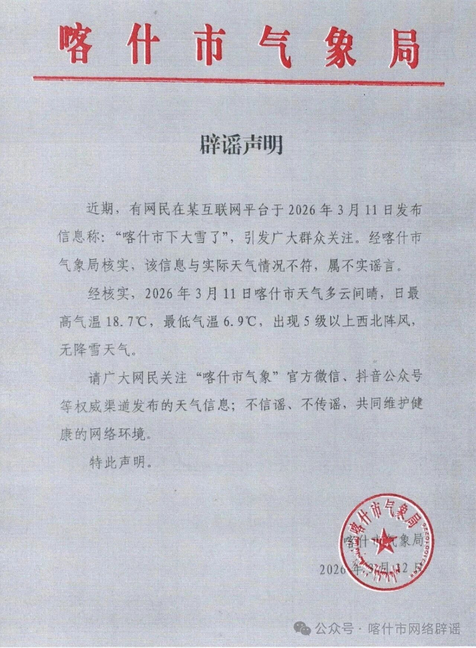 经新疆喀什市气象局核实,该信息为不实信息,3月11日喀什市天气多云间睛,日最高气温18.7C,最低气温6.9C,出现5级以上西北阵风,无降雪天气。但该自媒体账号为博取流量,编造与事实不符的信息,混淆视听、误导网民,造成不良社会影响。目前,相关违法不实信息已全部下架。