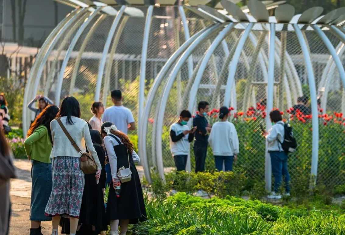 游客在辨认罂粟植株。图源:“中国科学院武汉植物园”微信公众号