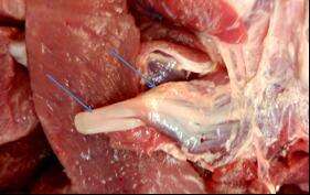 同时,为了进一步弄清此问题,佘锐萍教授专门到某超市猪肉销售柜台去寻找到了类似网上的白色带状物(见下图1),此物用手拉的时候可变长,放开后,它可渐渐缩回变短。用刀切开此白色带状物后部表面的肌肉后,展现在眼前的是一块肌肉结构(图2),而白色带状物正是这块肌肉的肌腱结构,并不是寄生虫。进一步翻开后发现,这块肉是从猪蹄部分割下来的一块肌肉。