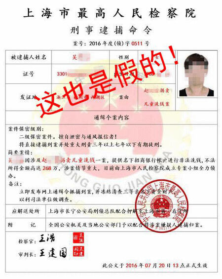 浙江辟谣网7月27日讯 2016年7月26日,杭州市反欺诈中心曝光一批假通缉令。就在前不久,杭州的张先生就因为信了假通缉令,最终汇给骗子几十万元。