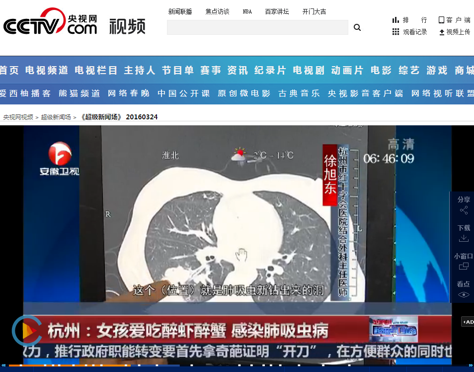 在求证过程中,有网友告诉记者,这样的故事情节似曾相识。记者随即截取这张图片,并且用“以图搜图”功能在网上进行搜索。结果发现,2016年3月24日,安徽卫视的《超级新闻场》早就播出过同样的片段,而当时播出时,该视频的字幕显示:“杭州:女孩爱吃醉虾醉蟹 感染肺吸虫病”,而其中的人物也叫小夏,感染的也是肺吸虫病,连“肺部CT”也是一模一样。