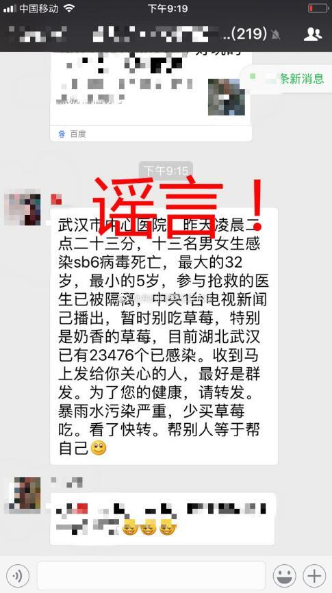 近日,荆州一聊天群又出现“武汉市某医院:昨天凌晨二点二十三分,十三名男女生感染sb6病毒死亡,最大的32岁,最小的5岁,参与抢救的医生已被隔离,中央1台电视新闻己播出,暂时别吃草莓,特别是奶香的草莓,目前湖北武汉已有23476个已感染”的不实信息。