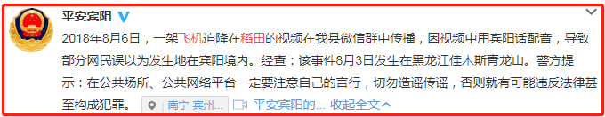 昨天晚间,广西宾阳县公安局对此视频辟谣:“2018年8月6日,一架飞机迫降在稻田的视频在我县微信群中传播,因视频中用宾阳话配音,导致部分网民误以为发生地在宾阳境内。经查,该事件8月3日发生在黑龙江佳木斯青龙山。”