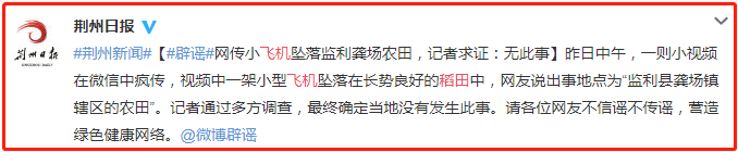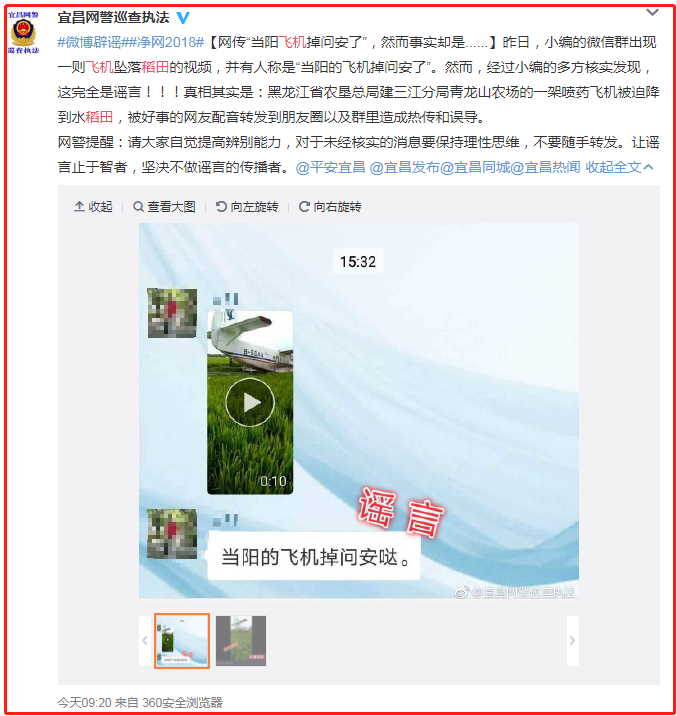 今天上午,湖北宜昌网警辟谣:“微信群出现一则飞机坠落稻田的视频,并有人称是‘当阳的飞机掉问安了’。然而,经过小编的多方核实发现,这完全是谣言!真相其实是,黑龙江省农垦总局建三江分局青龙山农场的一架喷药飞机被迫降到水稻田,被好事的网友配音转发到朋友圈以及群里造成热传和误导。”