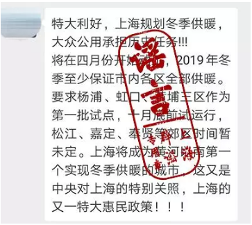 近日,网上流传一条“上海将成黄河以南首个冬季供暖城市”的消息。该消息称:“特大利好,上海规划冬季供暖,大众公用承担历史任务!!!将在四月份开始动工,2019年冬季至少保证市内各区全部供暖。要求杨浦、虹口、黄埔(浦)三区作为第一批试点,十月底前试运行,松江、嘉定、奉贤等郊区时间暂未定。上海将成为黄河以南第一个实现冬季供暖的城市。”这究竟是真的吗?