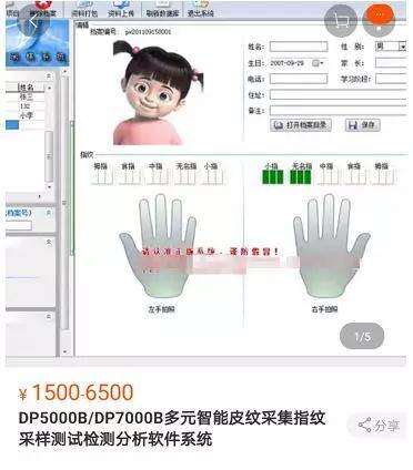 某宝平台上一项名为“多元智能皮纹检测”的介绍称,系统通过十指指纹的采样分析,对指纹交叉比对,能科学统计出被检测者大脑发育、皮质层状态和大脑多元智能潜能,并据此预测后天发展趋势、后天教育发展需求等。商家宣称,这项检测技术最早是1992年由美国加州大学遗传学教授K·弗里曼(K·Freeman)博士及其助手,在哈佛大学的霍华德·加德纳(Howard Gardner)博士的多元智能理论上,综合出来的一套检测系统。