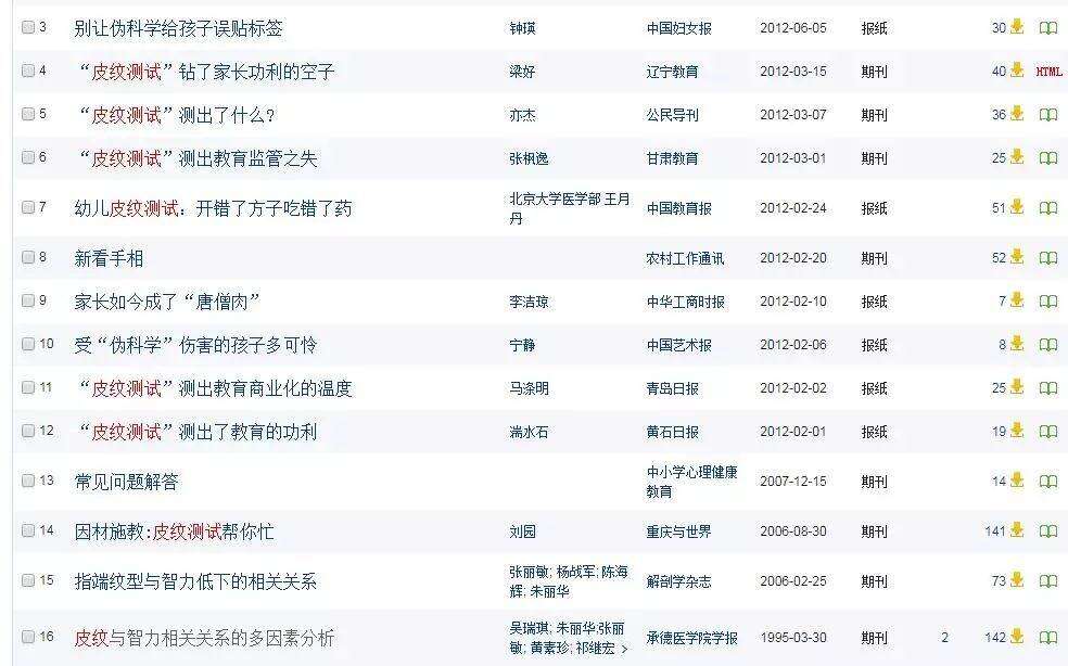 记者通过搜索发现,霍华德·加德纳确有其人,他是一位著名的心理学家和教育学家,在1983年提出过“多元智能理论”,并著有《智能的结构》一书。霍华德·加德纳的理论对传统智力测试的局限性提出批判。不过,当记者把搜索关键词变为“美国加州大学遗传学教授K·弗里曼博士”时,却发现根本没有这位“教授”的相关资料。从中国知网的搜索结果来看,也没有任何“K·弗里曼”的相关文章。不过,搜索“皮纹测试”,记者发现了不少刊发在权威媒体上揭露“皮纹测试是伪科学”的报道。