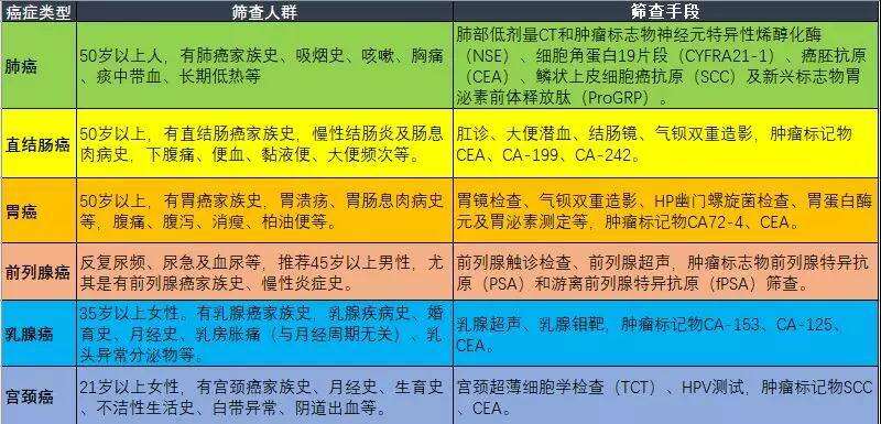 防癌体检和健康体检实际上是两个概念。健康体检,往往注重常规检查项目的全面性,筛检手段相对简单,并不一定包含针对某一特定癌症的专项检查手段,即使所含项目包括一些癌症检查项目,但其检查的深度和专业的判断还是有待加强。而防癌体检已然成为一种专业化体检,能借助于各种检查手段将早期或没有症状的癌症病人筛查出来。在防癌体检方面,迄今为止尚无完全理想的肿瘤标志物。此前,“一滴血可以测癌”“肿瘤标志物升高就是得了癌”等传言是不准确的,要想准确地检测癌症,应该进行规范化、个体化的癌症筛查。中华医学会健康管理学分会曾发布《健康体检基本项目专家共识》,对肺癌、乳腺癌、宫颈癌、结直肠癌、胃癌、前列腺癌六个癌症筛查中的血清标志物选择做了推荐: