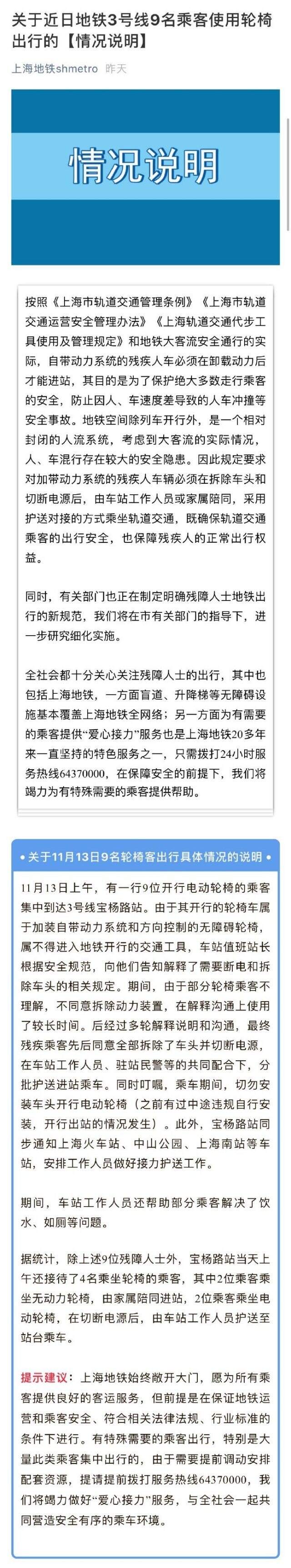 近日,网络流传“九名轮椅人士想要乘坐上海地铁却因轮椅上的电动车头被拒绝进站”的消息引发网民热议。[话筒]@上海地铁shmetro 发布情况说明:网传消息和事实存在出入。为了保护绝大多数走行乘客的安全,防止因人、车速度差导致的人车冲撞等安全事故,按照相关规定自带动力系统的残疾人车必须在卸载动力后才能进站。经过解释说明和沟通,乘客同意拆除车头并切断电源,在车站工作人员、驻站民警等的共同配合下,分批护送进站乘车。