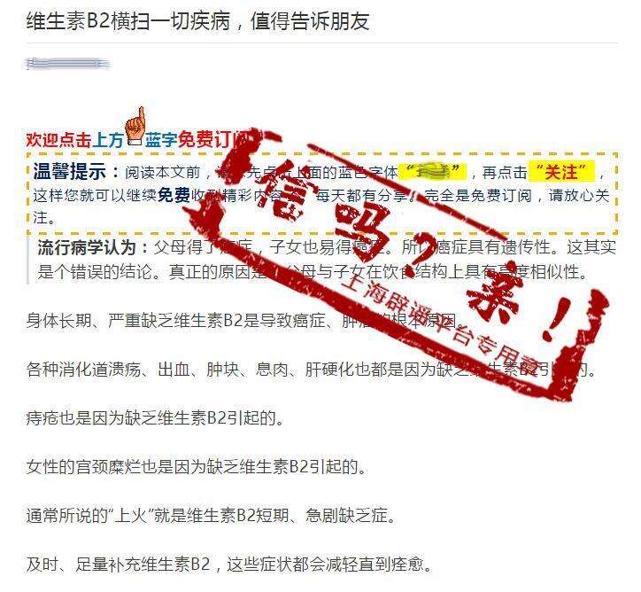 近日,一篇题为《维生素B2横扫一切疾病,值得告诉朋友》的文章在网上流传。文章大意:各种溃疡、出血都是因为缺乏维生素B2所引起的;通常所说的“上火”就是维生素B2短期、急剧缺乏症;身体长期、严重缺乏维生素B2是导致癌症、肿瘤的根本原因,而维生素B2能治疗一切疾病。这篇文章被大量微信自媒体转载,阅读量超百万。但是,这些说法靠谱吗?