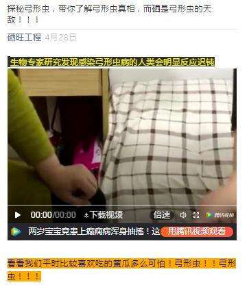 记者以“黄瓜”“硒”为关键字,追查这段视频谣言的出处,找到了一篇题为《探秘弓形虫,带你了解弓形虫真相,而硒是弓形虫的天敌!!!》的微信文章,文章中插入的一段视频就是近日网上流传的视频。