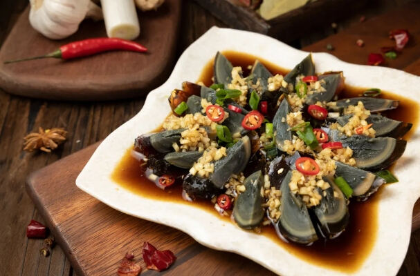 皮蛋搭配姜末、蒜,制作成凉拌皮蛋,不仅能去腥,还能中和其含有的碱性物质,有效去除碱涩味。
