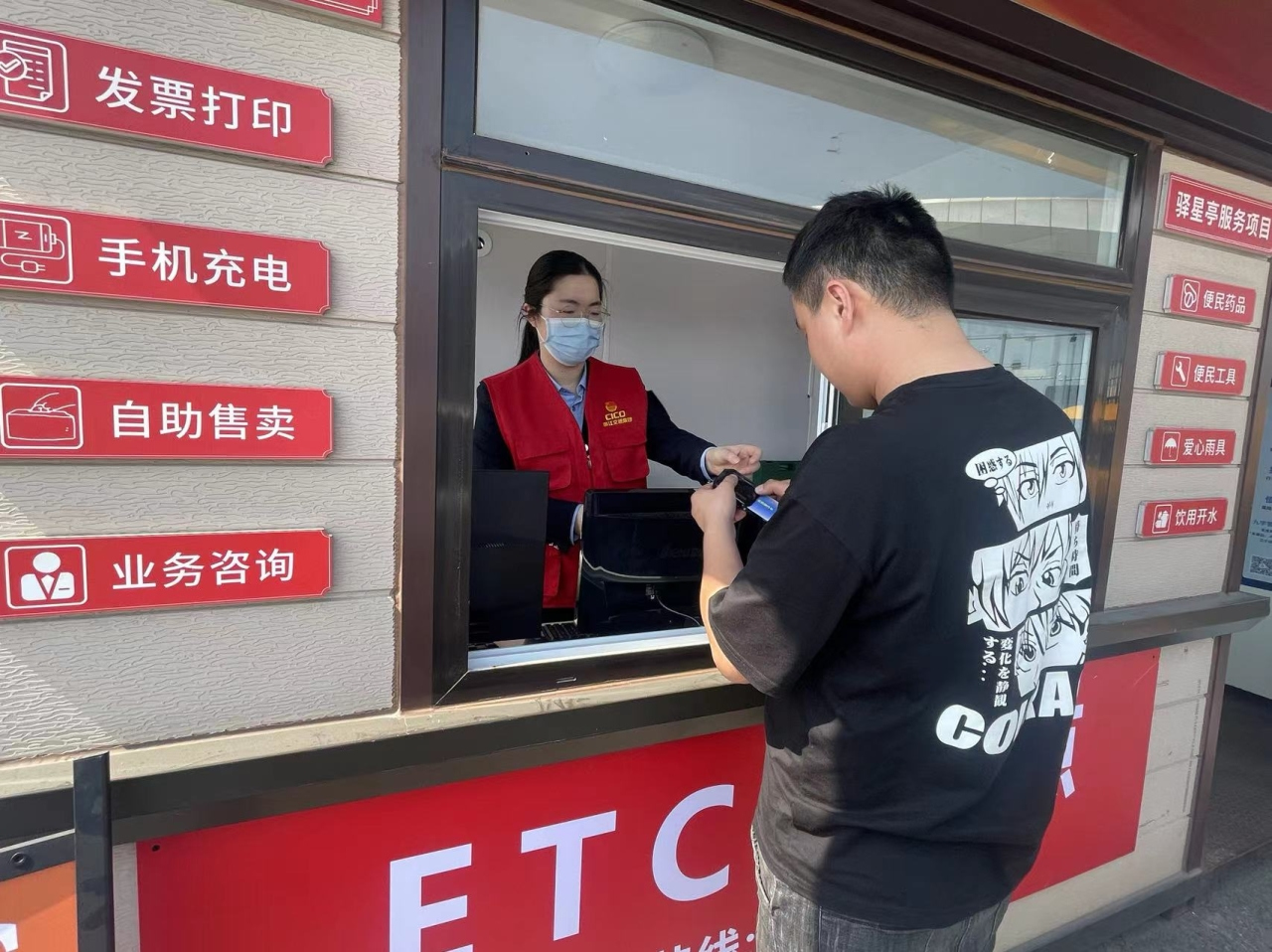 “你好,我想办理货车ETC,你们这儿可以办吗?”“请打开支付宝,我帮您线上办理安装。”在驿星亭内,“云客服”组员小袁正在帮助司机王师傅快速办理ETC。一旁的工作人员小林则正在远程回答绿通车司机的业务咨询,现场工作有条不紊。