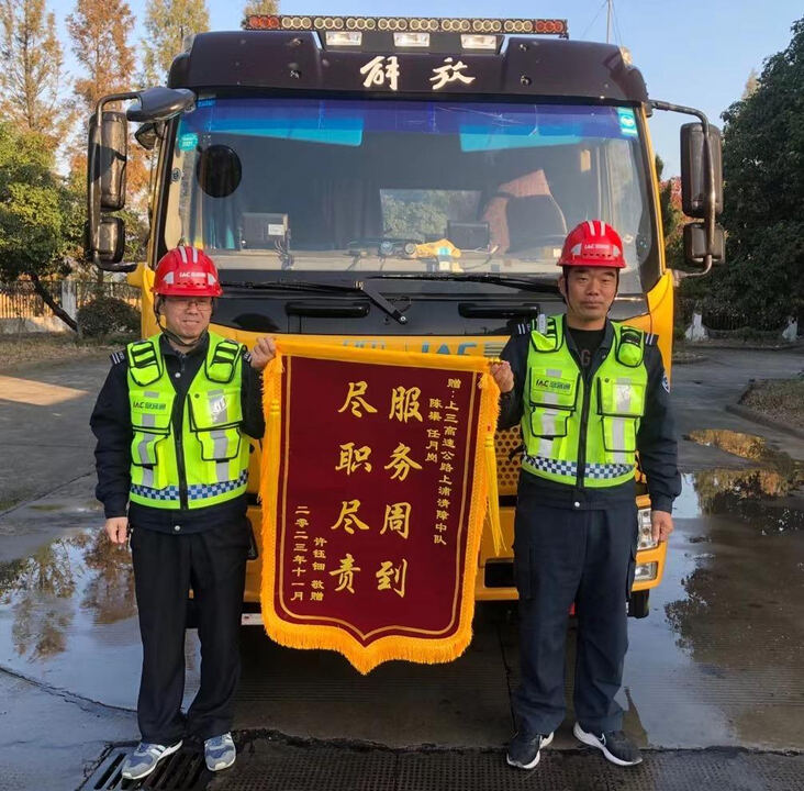 “真心感谢两位清障队员对我们一家的热情帮助,谢谢你们!”近日,来自杭州的许先生专程赶到浙江交通集团绍兴运行管理分中心上浦清障施救驻点,紧紧握着陈渠和任月岗两位清障队员的手连声道谢,送上写着“尽职尽责,服务周到”字样的锦旗。这是11月18日,在浙江省交通集团绍兴管理中心所辖的G1522常台高速上虞方向208公里处,上浦施救驻点员工将一辆因轮胎扎破的抛锚电动车安全拖到轮胎店维修,又帮司乘人员找回失物后的场景。