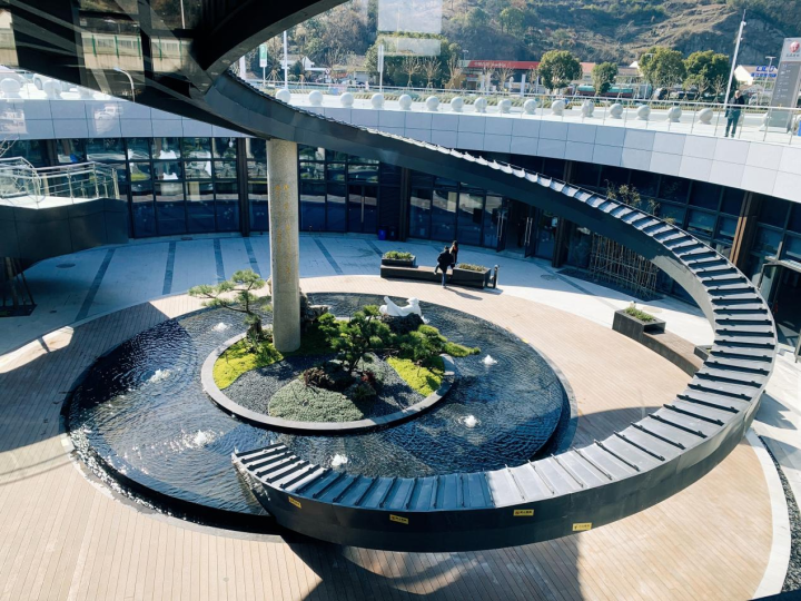服务区综合楼整体造型形似山峦,外立面玻璃设计形成立面框景造型,简洁挺括,尽显轻盈通透。中庭区域放置一座李白雕塑,旁有刻着《梦游天姥山吟留别》的石碑,辅以山石、绿植等装饰小品,以具象景观的方式重让司乘人员近距离感受唐诗魅力。围廊上的诗画灯笼画卷垂下,更是增添几分古典韵味。
