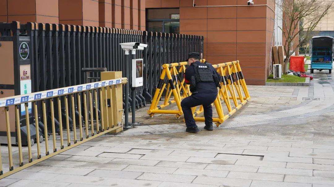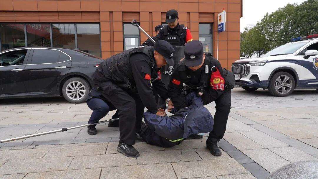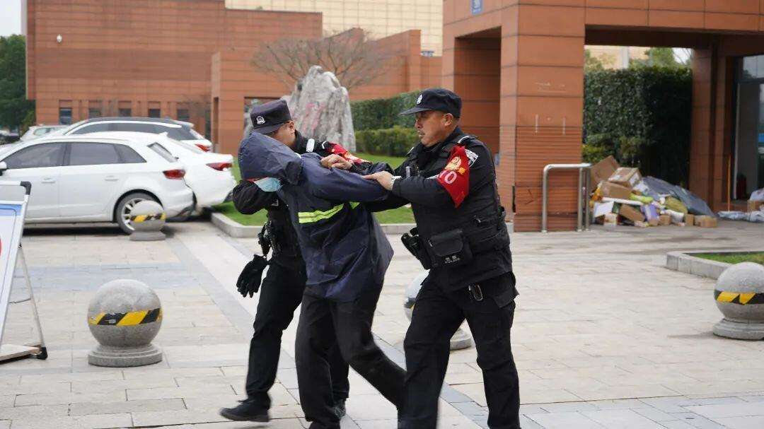 一辆外来车辆驾驶人员未主动出示访客码,推脱之际,迅速引起了安保人员的警惕。“可疑人员”突然行动,企图进入学校。安保团队迅速反应,一边启动一键报警,一边火速关闭校门并设置防冲撞装置,另外三人使用盾牌与钢叉迅速组成包围圈,采用战术分割、协同控制战术,与前来支援的陶朱派出所警务人员默契配合,成功制服"歹徒",并将其移送公安机关。