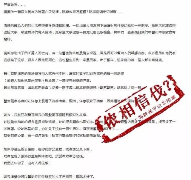 记者通过网络搜索发现,“室内放洋葱可以防感冒”的说法来源于一篇网文,文中讲述了两个故事:第一个故事是医生在某农场发现一户农民在家里放了洋葱,从而让一家人躲过了危险的流感;第二个故事,讲的是一个理发师在理发店的果盘中放了洋葱,让员工成功避免感染流感。两个故事都未点名时间和具体地点。