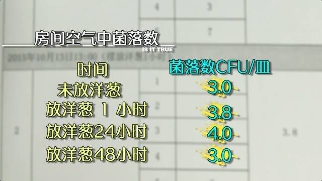 央视财经《是真的吗》做过一次相关实验。他们通过一家环境检测公司,在一间30平方米的房间里选择5个点测定平均值,来得到这个房间的微生物的总数。然后通过放置洋葱前后房间内菌落数的变化,来验证放洋葱能杀菌的传言。